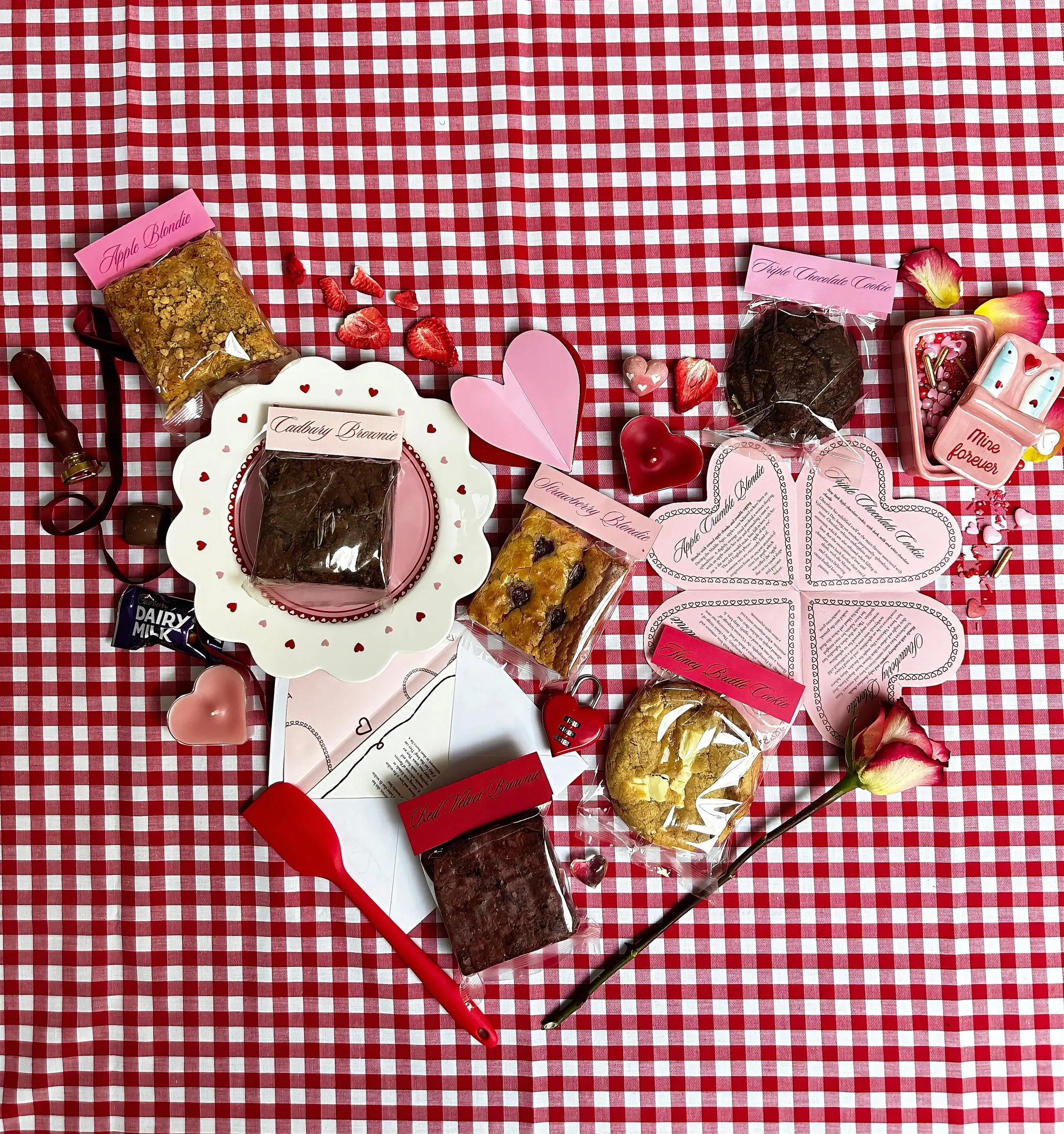 Each month you get a selection of 6 different brownies, bars or cookies, which fit within the months theme. You also get a menu card and letter, all designed by me, which talk you through the theme and flavours.